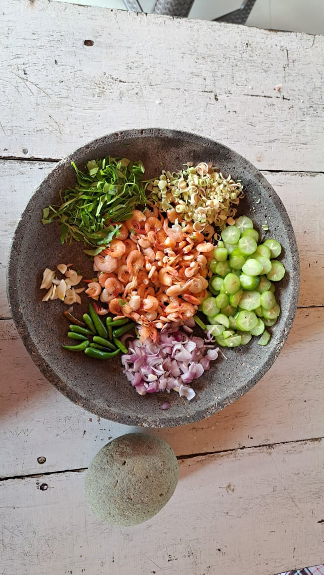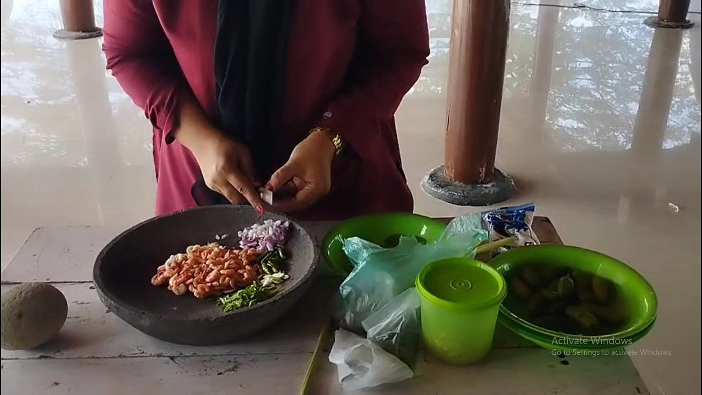 Asam Udeung adalah sambal tradisional khas Aceh yang berbahan dasar udang rebus, memiliki cita rasa asam, pedas, dan segar. Sering disebut "sambal ganja" karena rasanya yang bikin ketagihan, kuliner ini menggunakan udang cincang, belimbing wuluh, serai, daun jeruk, dan cabe rawit, menghasilkan aroma harum dan tekstur khas. Asam Udeung, atau yang lebih dikenal luas sebagai Sambal Ganja, adalah kuliner khas Aceh yang memiliki sejarah panjang sebagai hidangan pendamping nasi yang sangat digemari karena cita rasanya yang membuat ketagihan. Meskipun namanya cukup provokatif, perlu ditegaskan bahwa sambal ini sama sekali tidak mengandung ganja (cannabis). Berikut adalah sejarah dan asal-usul di balik penamaannya: 1. Filosofi Nama "Sambal Ganja" Penyebutan "Sambal Ganja" bermula dari metafora masyarakat. Kata "ganja" digunakan untuk menggambarkan efek "kecanduan" atau rasa ingin terus menambah porsi saat menyantap sambal ini. Perpaduan rasa pedas, asam segar dari belimbing wuluh, dan aroma udang menciptakan sensasi rasa yang sangat kuat, sehingga siapa pun yang mencobanya dianggap akan "ketagihan". 2. Asal-Usul Nama Asli: Asam Udeung Secara tradisional, nama asli hidangan ini adalah Asam Udeung. Asam: Merujuk pada bahan utama pemberi rasa segar, yaitu belimbing wuluh (asam sunti). Udeung: Berarti udang dalam bahasa Aceh. Sambal ini merupakan bagian dari tradisi kuliner masyarakat pesisir Aceh, termasuk di wilayah Lhokseumawe dan sekitarnya, yang memanfaatkan hasil laut segar dan bumbu dapur lokal yang melimpah. 3. Bahan-Bahan Utama Keistimewaan Asam Udeung terletak pada teknik pembuatannya yang tidak dimasak (mentah) sehingga nutrisinya tetap terjaga: Udang: Biasanya menggunakan udang windu atau udang kecil yang sudah direbus atau digoreng sebentar. Belimbing Wuluh: Memberikan rasa asam yang memecah rasa amis udang. Asam Sunti: Belimbing wuluh yang sudah dikeringkan dan digarami (bumbu wajib masakan Aceh). Bumbu Aromatik: Serai, bawang merah, cabai rawit, dan daun jeruk yang dicincang halus atau diulek kasar. 4. Kedudukan dalam Budaya Aceh Asam Udeung bukan sekadar sambal, melainkan menu penyelamat nafsu makan. Dalam sejarahnya, sambal ini sering disajikan untuk menemani Sie Reuboh (daging rebus) atau ikan goreng. Karena sifatnya yang segar dan membangkitkan selera, hidangan ini hampir selalu ada dalam jamuan makan adat maupun konsumsi harian keluarga di Aceh. Cara Dan Waktu Penyajian: Asam Udeung menjadi makanan tradisional Aceh khususnya di Kota Lhokseumawe, disajikan dalam keseharian masyarakat sebagai lauk dan di santap dengan nasi hangat, Asam Udeung terus di lestarikan turun temurun. Namun dalam beberapa tahun terakhir masakan Asam Udeung sudah terbilang langka dalam kehidupan masyarakat. Cara Pembuatan: Cara Membuat Campur semua bahan, tambahkan garam kemudian ulek/blender kasar. Asam udeung/ sambal ganja aceh siap disantap dengan nasi hangat.