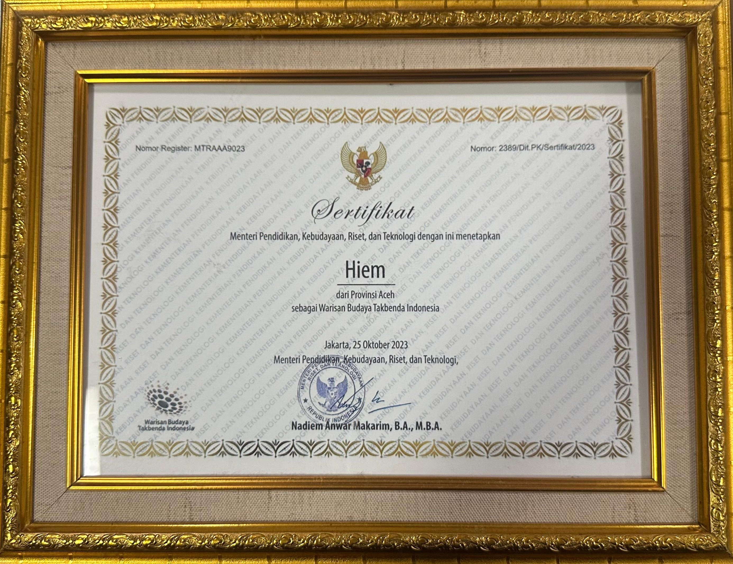 Hiem secara umum dapat dipahami sebagai teka-teki. Hiem merupakan salah satu tradisi lisan yang di masa lalu sangat membumi di Aceh, tapi sekarang dia berjalan sebelah kaki atau istilahnya meuchen-chen dalam Bahasa Aceh, kadang-kadang reubah, beudoh lee lhom (kadang-kadang jatuh, bangkit lagi), antara hidup dan mati. Hiem adalah salah satu wujud tradisi lisan khas Aceh berupa seni adu pikir. Hiem hampir mirip seperti teka-teki, namun dalam budaya Aceh, hiem memiliki aturan seperti pantun atau dalam budaya meuhiem dikenal istilah bahasa meuhantok, yaitu bahasa yang saling beradu, ber-sajak dan ber-rima. Mari simak contoh berikut ini: koh lipah pula lipah pucôk jih reubah u dalam paya meunyoë hiem nyoë neupeuglah jadéh meunikah geutanyoë dua Tebang nipah tanam nipah Pucuknya rebah ke dalam kolam Kalau teka-teki ini bisa kanda jawab Jadilah kita menikah berdua Ta ek u gle koh bak jeumeureu keudeh tasadeu bak kaye raya blet kilat khum geulanteu kabeh meusiseu dalam blang raya Naik ke gunung tebang pohon jeumeureu Di sana tersandar kayu yang besar Berkelip kilat berdegum Guntur Berserakan semua ke seluruh sawah bak tajak-jak meuteumei situek bak ta duek-duek cob keu tima phop le dichen phop le di duek nyang keuh cangguek musem keanoeng sa Sambil berjalan-jalan mendapatkan situek Sambil duduk-duduk dijahit menjadi timba Phop dia melompat phop dia duduk Itulah Kodok di musim hujan Demikianlah seni bermain hiem, teka-teki disampaikan dengan urutan menantang dan membuat lawan tertarik menerima tantangan. Pertanyaan dibuat sedemikian rumit dalam wujud majas yang berkias. Di sinilah keindahan hiem dibuka. Contoh di atas menujukkan bentuk tantangan di bait pertama, lalu pertanyaan di bait kedua. Bila lawan tertarik dengan tantangannya maka ia akan lanjut memperhatikan bait lanjutannya. Di bait kedua, penanya memberi petunjuk dengan pohon dan tanda-tanda-tanda hujan. Sedangkan bait ketiga merupakan jawaban atas pertanyaan penantang. Dapat diperhatikan bahwa setiap baris dilengkapi bahasa meuhantok, dilengkapi dengan sajak dan rima sehingga Ketika disampaikan terasa indah didengarkan.
